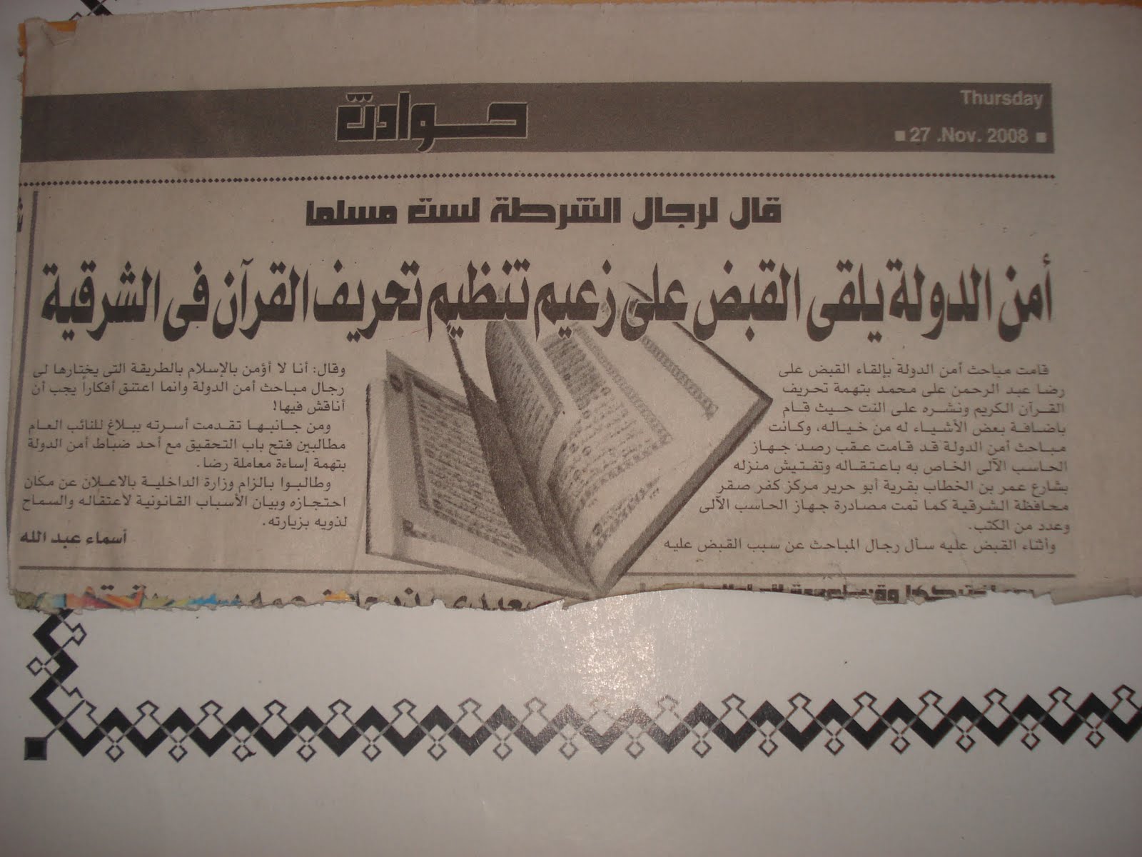 16ـ بعد هذا المقال بأسبوع تقريبا وتحديدا فجر الإثنين الموافق 27 /10/2008م وفي تمام الساعة الثانية صباحا ـ جاءت قوة من أمن الدولة بقيادة الضابط (أحمد خضر) حاصروا البيت من كل اتجاه وأحاطوه بكردون أمني من جميع المداخل والسطوح بالجنود المدججين بالسلاح ، وهذا ما حكاه لنا الجيران فيما بعد. دخلوا علينا البيت كعادتهم ودخلوا الشقة التي أقيم فيها وسألني الضابط (أحمد خضر) عن مكان حجرتي ، فأجبته ، فدخل الحجرة وجد جهاز الحاسوب الخاص بي ، سألني ثانية :هل هذا هو الجهاز الخاص بك.؟ قلت : نعم ، سألني سؤال لن أنساه ، يدل على جهل الجهاز الذي يتبع له كضابط أمن دولة قال لي : موقعك أيه.؟ قلت له مفيش حاجة اسمها موقعك أيه :: في إيميل وفيه مواقع أنشر عليها كتاباتي فسكت ولم يرد ، ثم أمر رجاله بحمل جهاز الحاسوب ونقله للسيارة ، كانت الشاشة التي أستخدمها مقاس 21 بوصة وثقيلة جدا ، وعندما حاول أحدهم حملها فوجد أن تركها أفضل له حرصا على عموده الفقري ، وهذا التصرف كان سببا في إظهار مزيد من الجهل لضابط أمن الدولة ، لأنه بعد أن عاد من جولته لتفتيش جميع أركان البيت وجد الشاشة مازالت مكانها على المكتب ، فصرخ في وجههم قائلا: أن مش قلت لكم شيلوا الكمبيوتر ..!!. انتهوا من تفتيش البيت فلم يجدوا فيه إلا جهاز الكمبيوتر وبضعة كتب للدكتور أحمد صبحي منصور ، وجميعها منشورة على صفحات الإنترنت منذ سنوات ، أمرني أن أغير ملابسي ، وأخذوني معهم في سيارة بوكس ، وذهبوا بي إلى مركز شرطة كفر صقر. وتم حبسي في طرقة بين زنازين السجن الخاص بمركز الشرطة بكفر صقر:: مواصفات هذه الطرقة :: كانت عبارة عن طفاية سجائر لعدد حوالي 20 شخص ، وهذا هو عدد المساجين في عدد أربع زنازين تطل على هذه الطرقة ، ومعظمهم كانوا يدخنون السجائر والبانجو داخل السجن ، ومعهم أجهزة تليفون محمول ومعهم بعض مقومات الحياة وبعض المفروشات والبطاطين ، لأنهم سوابق وتجار مخدرات وحبايب البيه ضابط المباحث ، أما أنا استحق النوم في هذه الطرقة على البلاط وبدون فرش أو غطاء لمدة خمسة أيام من فجر الإثنين 27 أكتوبر حتى عصر الجمعة 31 أكتوبر ، وكان هؤلاء المساجين ينظرون لي من شباك الزنزانة ويسألونني كل حين انت جاي في أيه ومقبوض عليك ليه ، وكان جميع العاملين في مركز الشرطة يرفضون التعامل معي أو مساعدتى بمجرد أن يعلم أحدهم أن من أحضرني إلى هنا (أمن الدولة) ، وكان أمين الشرطة يوزع بعض التعيين على المساجين أمام عيني ، وكأنه لا يراني ، وخلال هذه المدة تركوني بدون طعام ، والمضحك أن أحد المساجين قال لي أنا عارف انت جاي هنا ليه ، قلت له من الذي أخبرك قال أنا سألت الضابط محمد بيه فقال لي أن تهمتك أنك { تكره (من الكـراهية) القرآن } ، وهذه أغرب وأعجب تهمة أسمعها في حياتي ، ولكن هذه التهمة أثبتت لي فيما بعد علاقة أمن الدولة الوثيقة بما نشرته صحيفة الخميس عني في مقال بعنوان (القبض على زعيم تحريف القرآن الكريم بالشرقية). على هذا الرابط .. http://3.bp.blogspot.com/-1VBN99KFU3Y/TYPQ50fiCPI/AAAAAAAAAHA/t-1QnXpV7Rk/s1600/DSC08912.JPG وتم رفع دعوى ضد الجريدة ورئيس التحرير ، فأُجْـبِرَ على نشر تكذيب في العدد التالي مباشرة يُقر فيه أنهم قد تورطوا في عنوان لم يكن له أي أساس على هذا الرابط http://1.bp.blogspot.com/-3Afr2CiMm6Q/TYPRVPGrsKI/AAAAAAAAAHI/3Gg60uXXhnU/s1600/DSC08909.JPG ــ ثم بدأ التحقيق معي يوم الأربعاء من العاشرة صباحا حتى السادسة مساء عن طريق (أحمد خضر) الذي اعتقلني من بيتي ، وكان معنا عبر الهاتف مدير أمن الدولة في الشرقية (عبداللطيف الهادي) وكان التحقيق عبارة عن أسئلة عن جميع المقالات التي نشرتها من قبل على الإنترنت ، والتي قاموا بطبعها على ورق لسؤالي عنها ، هل هذه المقالات من تأليفك ، ثم يطلب مني أن أقول مضمون كل مقال باختصار ، ثم بعد ذلك دخلوا معي في أسئلة تخص الدين والعقيدة ، هل تؤمن بالشفاعة .؟ ، هل تؤمن بعذاب القبر .؟، هل تؤمن بالأحاديث.؟ لماذا لا تصلي في المسجد.؟ ، وكانت إجاباتي واضحة حسب معتقداتي الشخصية ، وحسب ما أؤمن به ، ثم قال لي إن بعض أهل أبوحريز يكرهوك يا رضا قلت له لا يوجد إنسان في هذ